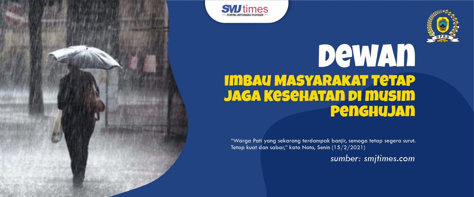 Cuaca ekstrem berupa hujan lebat diprediksi masih akan berlangsung di bulan Februari ini. Oleh sebab itu, anggota dewan dari Fraksi PDI I Noto Subiyanto mengimbau warga Pati untuk selalu menjaga kesehatan dan meningkatkan imun tubuh agar tak mudah terserang penyakit.